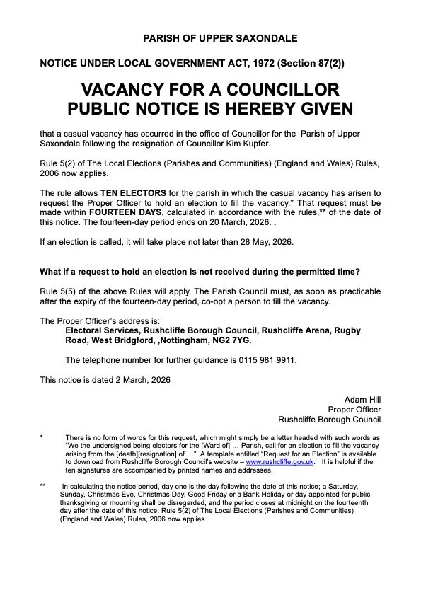 A planning application was submitted to Rushcliffe Borough Council (RBC) by The Rock Church & The 1st Bingham Scouts for change of use of the former Catalyst Church. The Upper Saxondale Parish Council (USPC) was asked by RBC for their views on this application. At the USPC meeting held on 18th September 2023, residents were able to share their views on the planning application. Taking all views into consideration, the USPC has resolved to object to the change of use. The USPC response has been submitted to RBC who will make the final decision on the planning application. You can read USPC’s full response here.